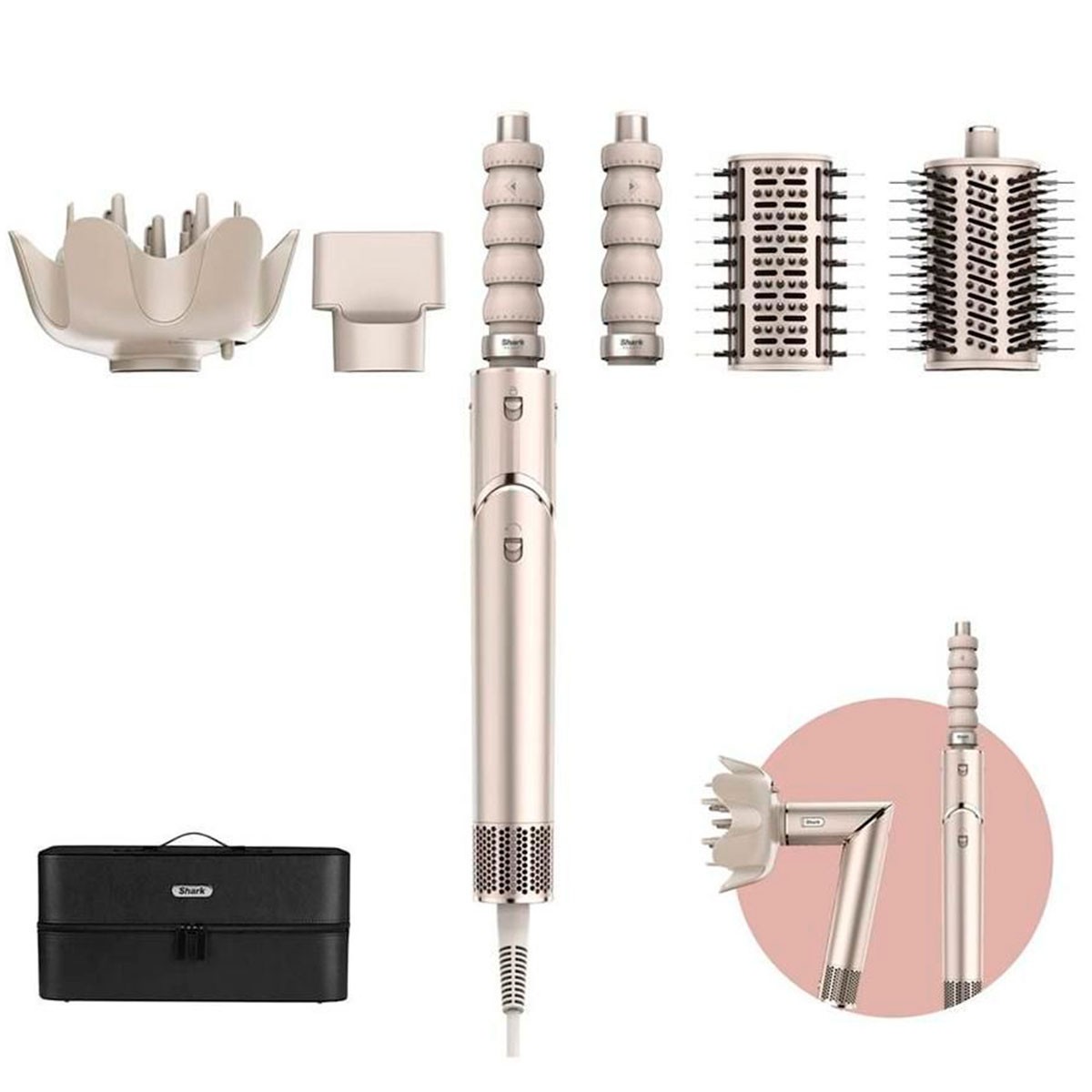 Incluye: Secador de pelo/Moldeador (color Champagne), Concentrador, Difusor, 2x Rizadores automáticos (1 dirección derecha, 1 dirección izquierda), Cepillo redondo, Cepillo alisador, Estuche rígido, Guía de estilismos.