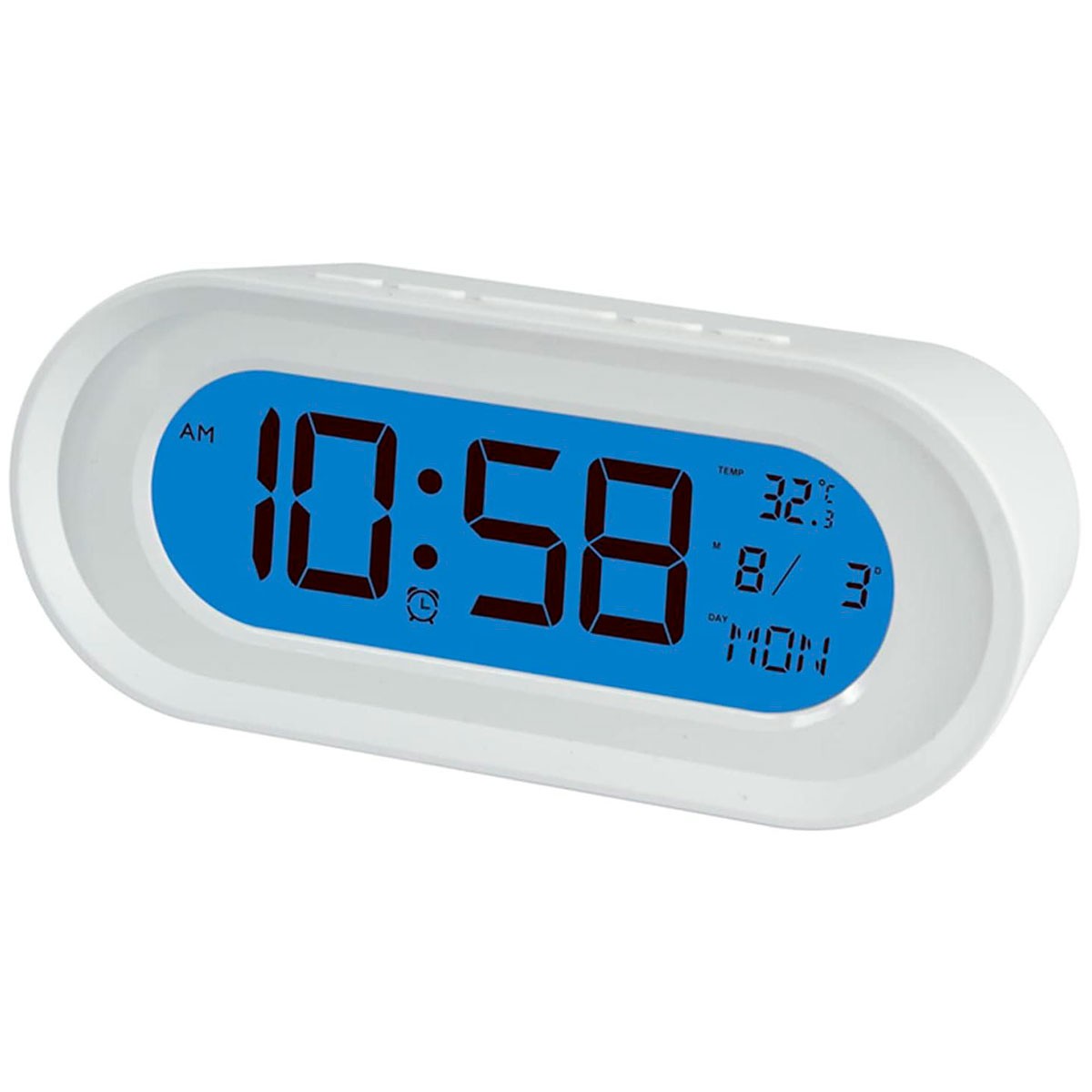 Reloj despertador con luz de fondo azul.